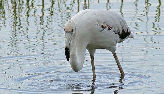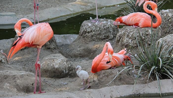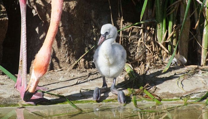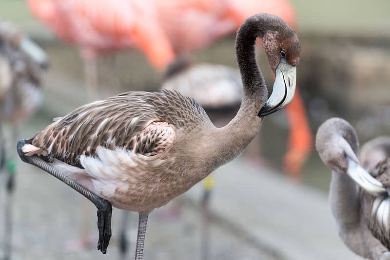 Los polluelos tienen un plumaje gris con pocos o ningún pigmento rosa. Del mismo modo, la dieta antinatural de los flamencos de zoológico los lleva a tener un plumaje más bien blanco.