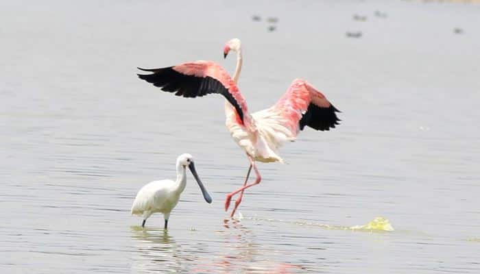 Las diferentes adaptaciones significan que los flamencos rosados y enanos pueden filtrar la comida uno al lado del otro sin competir entre sí. La comida destruida por los flamencos enanos sería demasiado pequeña para los flamencos rosa, la comida de los flamencos rosa demasiado grande para los flamencos enanos.