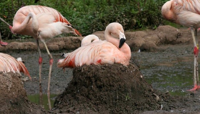 Las hembras son más activas en la construcción de nidos que los machos. Los nidos están muy juntos. Las enormes colonias de flamencos enanos, por ejemplo, tienen hasta cinco nidos por metro cuadrado.