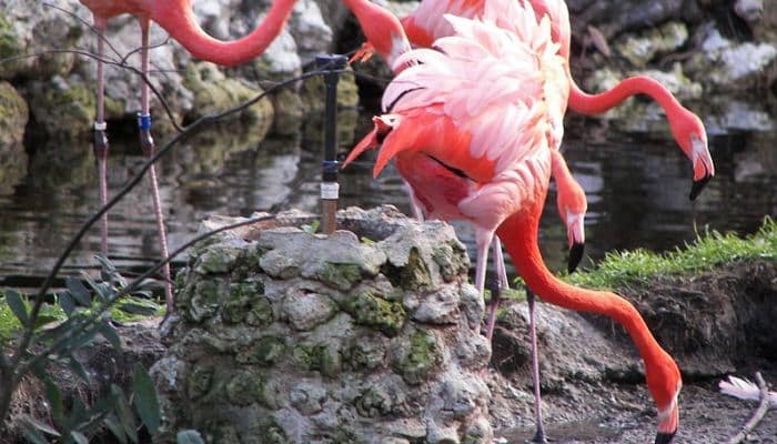 Además de estar en el agua, los flamencos pueden estampar sus patas palmeados en el lodo para remover la comida desde el fondo. Los flamencos son capaces de volar, y los flamencos en cautiverio a menudo requieren que se les recorte el ala para evitar que escapen.