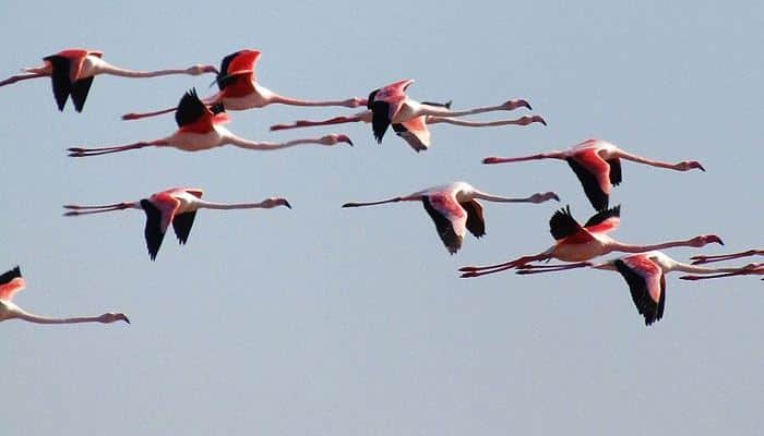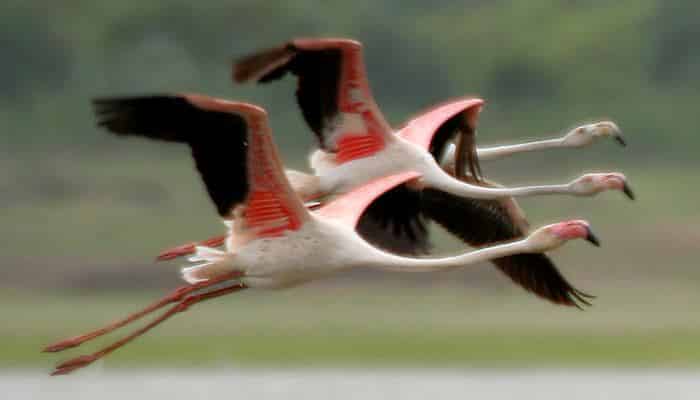 Alcanzan velocidades de vuelo de 50 a 60 km/h. Los flamencos que vuelan en grupos suelen formar formaciones V que ahorran energía. Por lo general, se toman algunas medidas antes del despegue y después del aterrizaje.