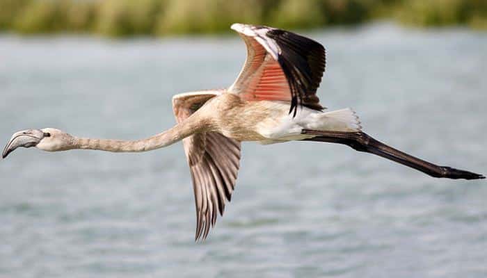Medido a lo largo del cuello, el número de las vértebras del cuello no está por encima de la media grande con 17; con los cisnes Z. B. es 25. La cabeza es muy pequeña en la relación a la altura, así como los pies; con el rosa y el flamenco enano, el primer dedo se muestra a la espalda y los tres restantes hacia adelante (anisodáctilo), los flamencos andinos y james carecen del primer dedo (tridaktíl). Los dedos de las patas dirigidos hacia adelante se conectan a través de las pieles de nadador.